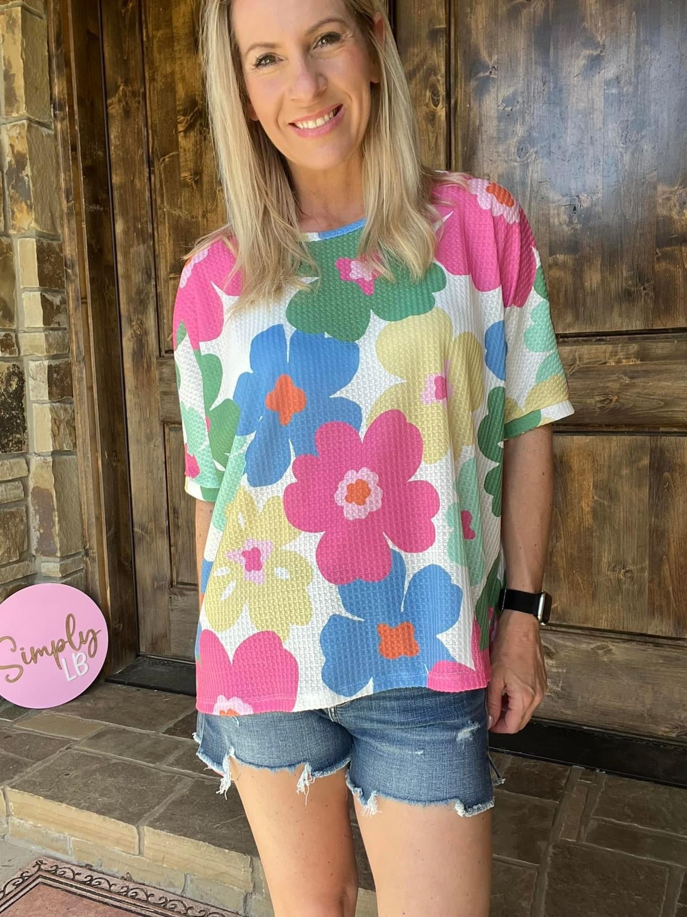 This floral waffle knit top is a must-have addition to any closet. The oversized fit guarantees comfort and the vibrant colors add a pop of fun to any outfit.